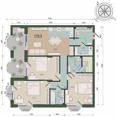 Площадь: 110.3 м2 (комнаты: 17-16.3-14.9м2)
